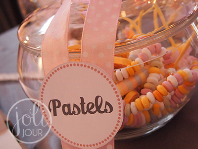 • Nous pouvons créer pour vous des étiquettes pour accessoiriser votre bar à bonbons en location, avec des rubans et des petits détails aux couleurs de votre mariage !